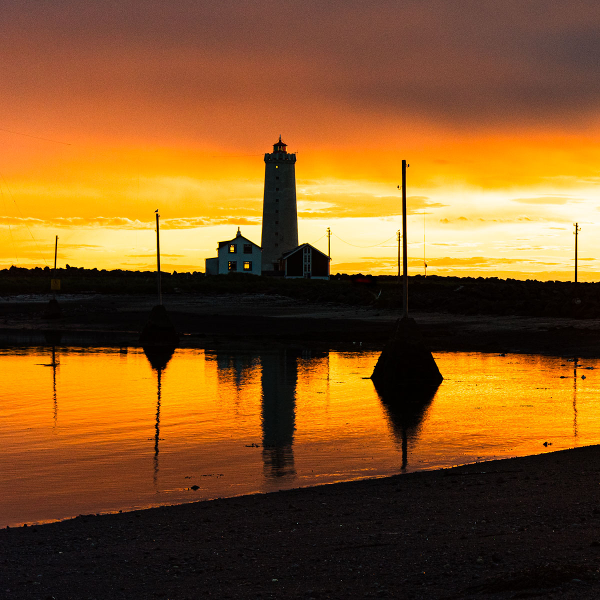 Blick in die Nacht auf den Leuchturm auf Island.